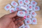 - Đặt một viên rửa vào ngăn chứa (không cần bóc lớp màng vì nó tự tan trong nước). Tùy vào số lượng và độ bẩn của bát đĩa, có thể dùng nửa hoặc cả viên.