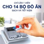 - Đặt một viên rửa vào ngăn chứa (không cần bóc lớp màng vì nó tự tan trong nước). Tùy vào số lượng và độ bẩn của bát đĩa, có thể dùng nửa hoặc cả viên.
