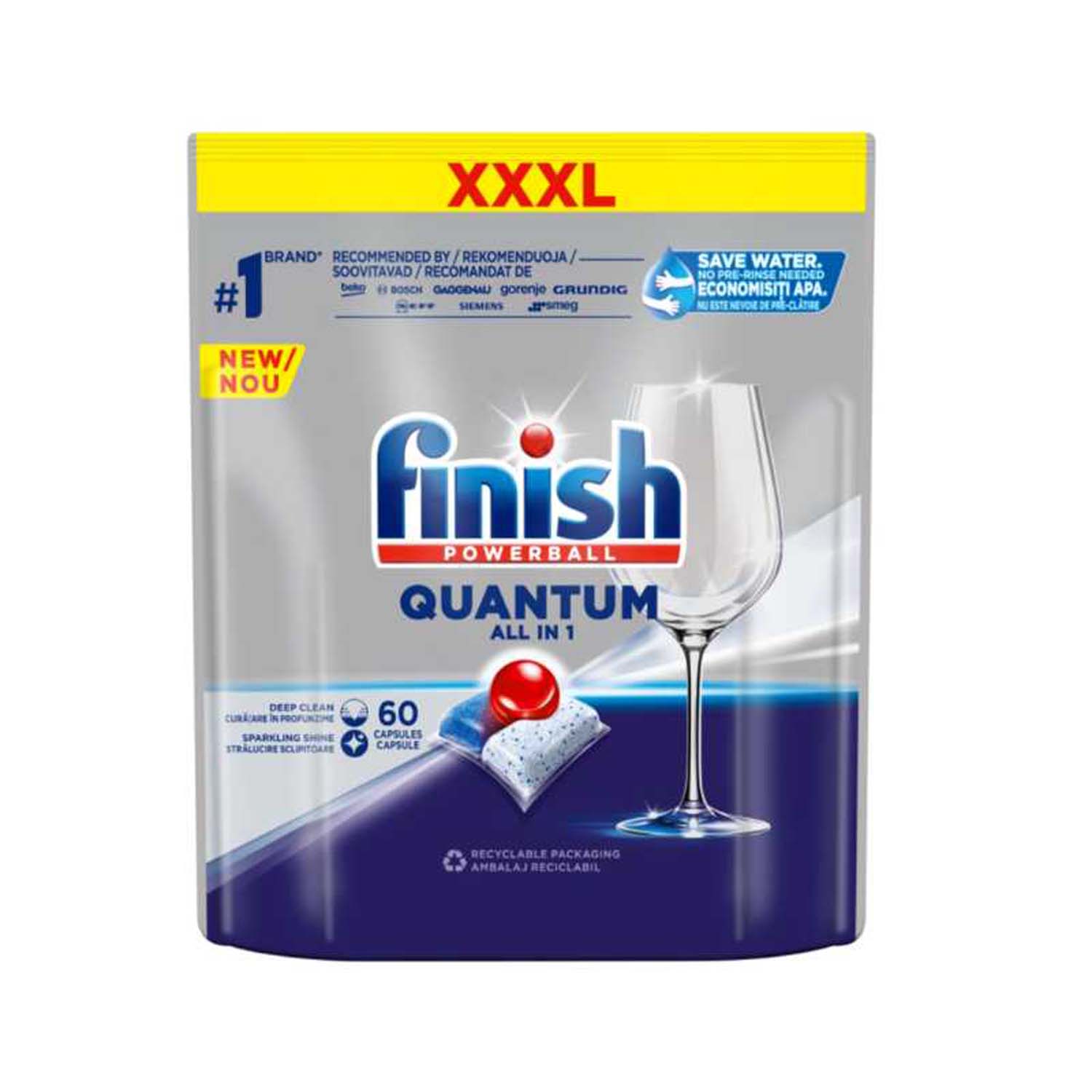 Viên rửa bát FINISH Quantum All in 1 túi 60 viên với 12 chức năng tích hợp giúp thay thế bột rửa bát, muối rửa bát và nước làm bóng, chỉ cần dùng 1 viên cho mỗi lần rửa, giảm bớt việc đo lường và sử dụng riêng lẻ các sản phẩm tẩy rửa khác.
